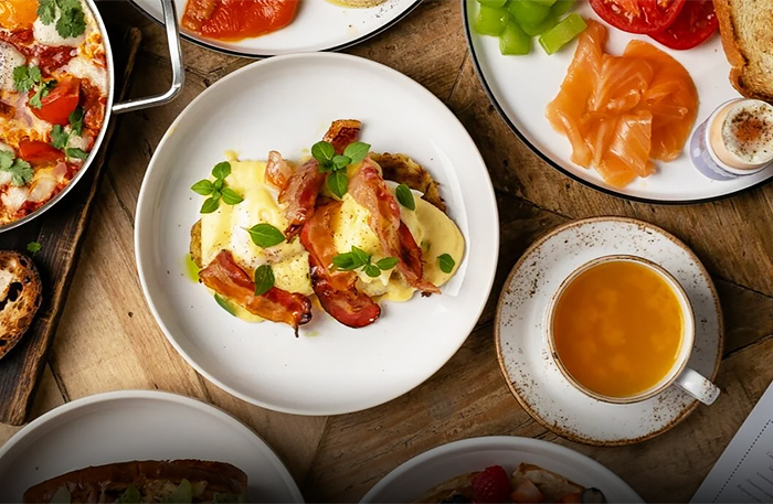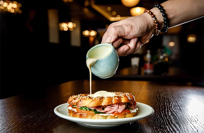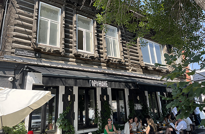 Теперь о печальном. Что для меня было удивлением, так это «Горожане», очень популярное место, туда мы отправились завтракать. В Екатеринбурге проблема с парковками похлеще, чем в Москве, так что, еле припарковавшись на полузаброшенной территории, отправляемся на завтрак. Дом датирован 1917 годом. Низ каменный, верх — темное дерево и резные наличники. Строгий дизайн купцов-промышленников. Таких домов в Екатеринбурге много, и это определенный вайб на фоне небоскребов. При входе в ресторан приятная веранда. Еле ухватив свободный столик, садимся под черной маркизой с надписью «Горожане», которая по леттерингу очень напоминает московский «Горыныч». Выносят приветственный бокал игристого, правда, в странном фужере, совершенно под игристое неподходящем, я сразу почувствовала неладное.