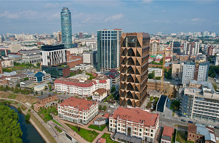 Два часа пути — и вот мы в Екатеринбурге. Последний раз я была тут лет 12 назад и город не узнала. Сплошные небоскребы. Стояла жара 40 градусов, и это очень похоже на Дубай — только с советскими памятниками, мемориальными досками и внезапными островками деревянных и краснокирпичных домов. По архитектуре сразу видно: тут уверенный промышленный регион. Екатеринбург — музей конструктивизма под открытым небом, около 120 сохранившихся зданий. В этом году Екатеринбург отмечает 300-летие, и в архитектуре прослеживается связь от Екатерины I до нынешних времен. Есть даже жемчужина современной архитектуры от именитого британского архитектурного бюро Foster + Partners. Проекты Нормана Фостера много кто планировал в России, но первый реализованный, Diamond Building, случился именно в Екатеринбурге. Это штаб-квартира АО «Русская медная компания», фасад состоит из граней, форма которых учитывает угол падения солнечных лучей и отражается медным цветом.