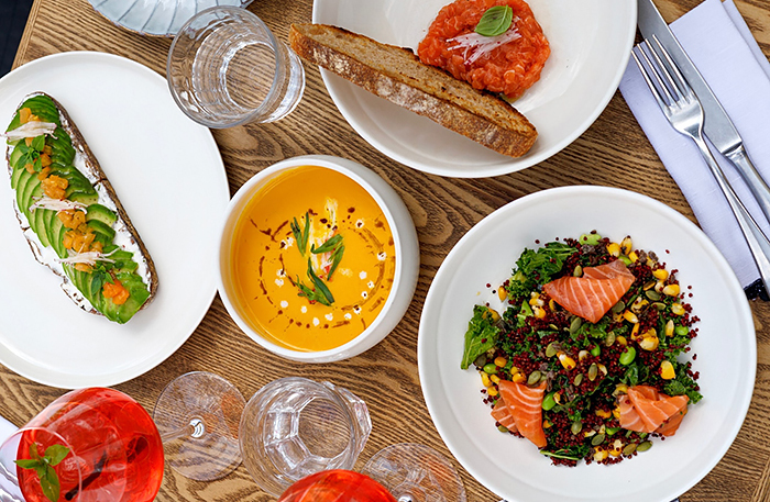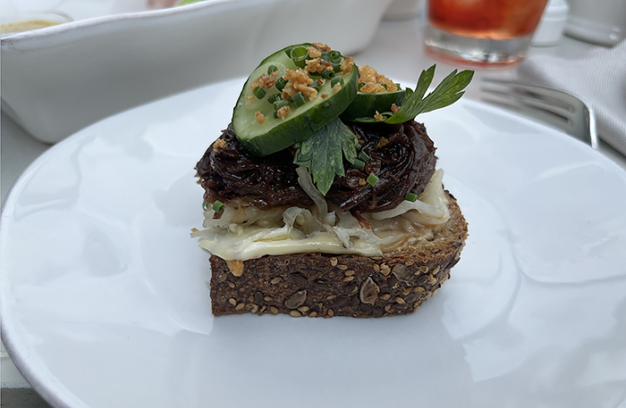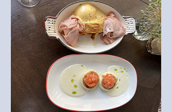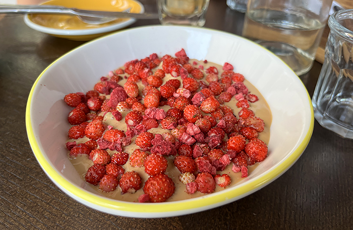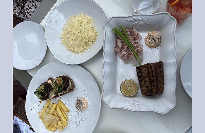 Назвала официанту пять позиций — и три из них были в стопе, включая яйца (два пашот, спаржа, романо) и оладушки из кабачков. Странное дело, для завтраков вещь недопустимая. Земляничный десерт «Митькина радость» потом нашелся, но оказался сладким месивом, приторным до гликемической комы. Сырники с тартаром из лосося в пармезане — на вкус «оригинально, но многое спорно». Мортаделла в картофельном гратене была посредственная, и я расстроилась окончательно.