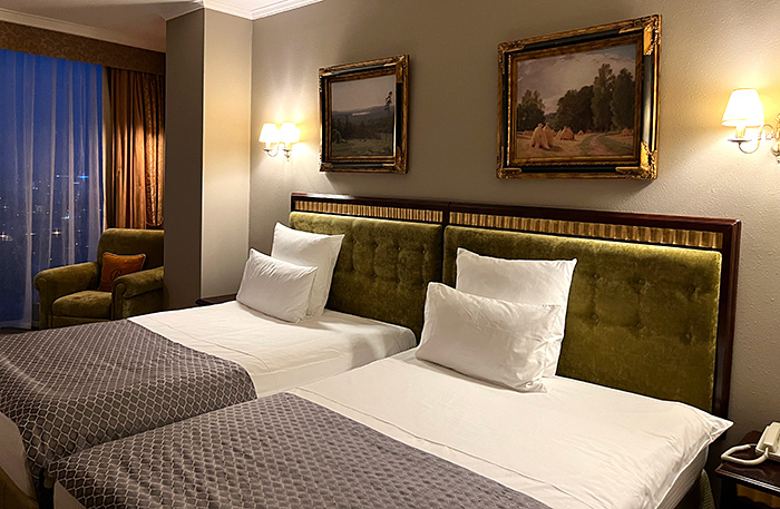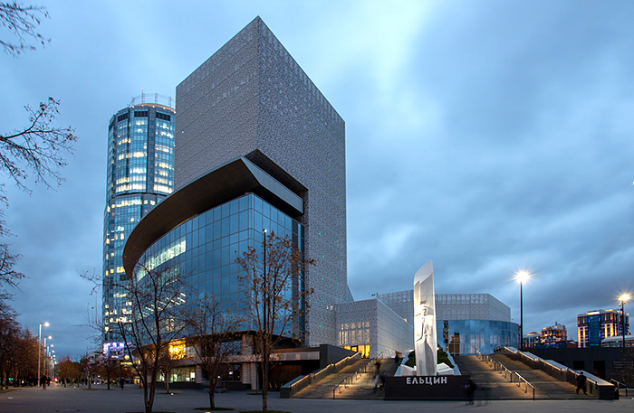 Поскольку поездка на машине из Челябинска в Екатеринбург случилась спонтанно и пришлась на проведение в городе крупнейшей промышленной и технологической выставки «Иннопром», то наш выбор отелей был невелик. Остановились в отеле «Высоцкий» в одном из самых больших небоскребов Екатеринбурга: ресепшен на 37-м этаже, номер на 39-м, открытый бассейн с видом на город — на 54-м.