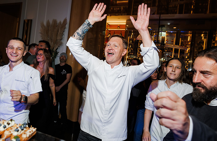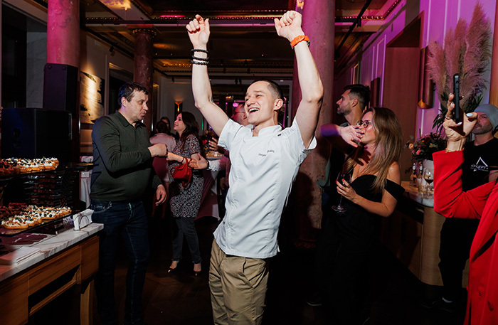 Андрей Шмаков — человек-праздник с невероятной жизненной энергией — решил объединить два праздника в один. 130 гостей. На втором этаже «чинно-благородно» сидели гости за внушительные 20 тысяч рублей с человека. А на первом этаже была вакханалия: 14 молодых шефов презентовали свои блюда, а восемь шефов постарше пели со сцены для всех гостей в караоке. Все это под веселые танцы.
