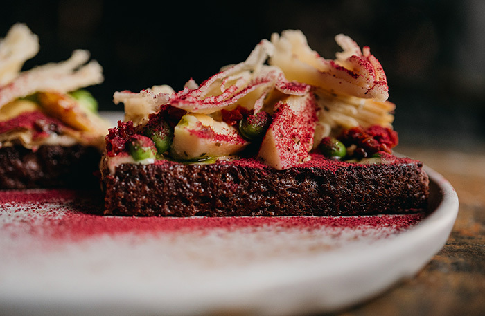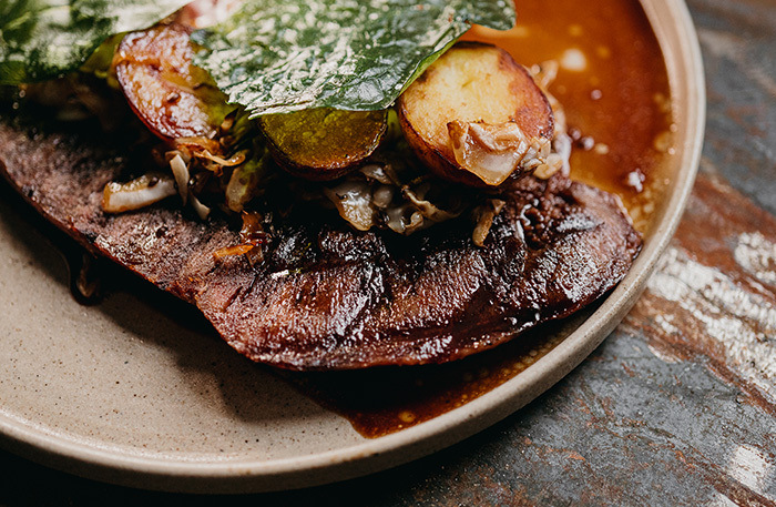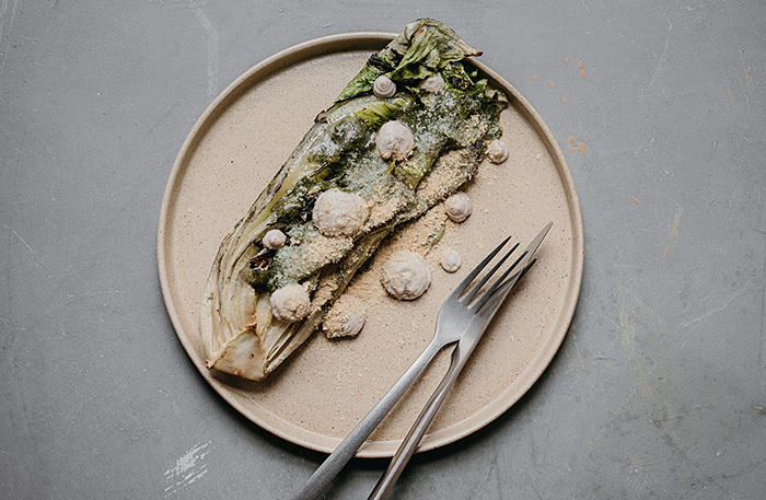 • опаленный на огне романо с веганским пармезаном — красноярский шаманизм. Впервые от ресторана получила настолько детальное описание всех блюд и коктейлей (с ценами, аллергенами и даже скриптом для сервиса) в идеально структурированной таблице. Не могу не поделиться описанием: «Стейк из салата романо, обжаренный на масле нуазет. Соус: зеленая гречка, пробитая с маринадом из варенья из лепестков розы, кокосовыми сливками и дезактивированными дрожжами (веганский пармезан), чимичурри из кинзы — пряно-острый соус, который тут готовят из листьев петрушки и кинзы на базе кислого маринада и растительного масла. Веганский пармезан». А с виду просто салат с кристаллами сыра. Но видишь вырывающиеся из печи контролируемые искры, когда ребята шевелят там поленом, и понимаешь: умеют тут управлять стихиями;