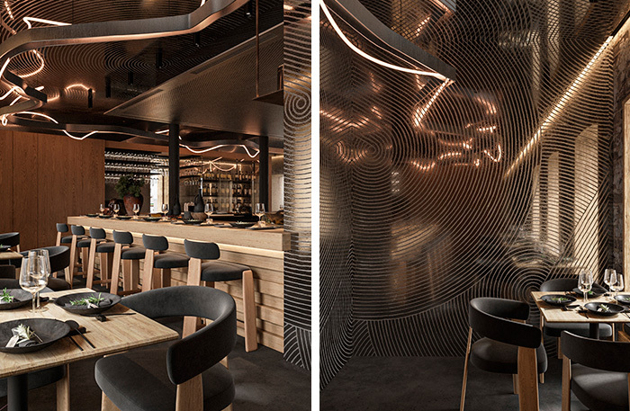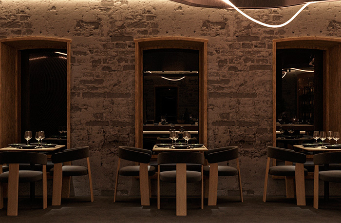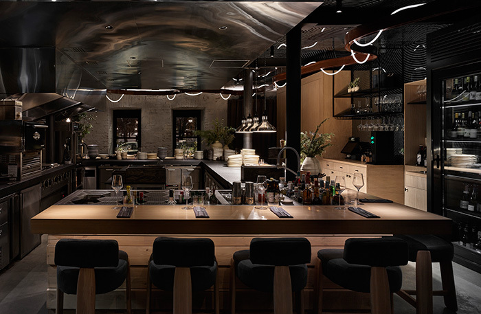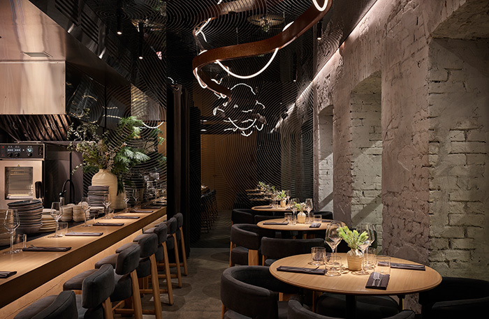 Камерный ресторан на 44 места выстроен вокруг открытой кухни, огромной по масштабу для этого пространства: три метра на два. Она, как сцена в центре зала, окружена «зрительскими» местами. На кухне ребята-повара, большинство из них приехали из Красноярска и привезли в Москву, на Патрики, чистую энергию Енисейской Сибири. Если кто помнит темный ресторан Patara, оценит, как 0,75 Group преобразовали пространство: теперь тут красивая кухня, люди и атмосфера.