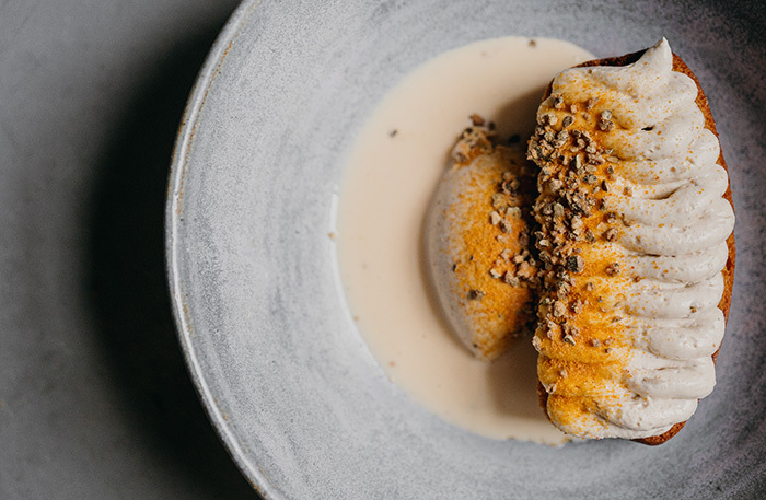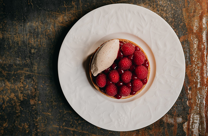 Десерты небанальные. Александр Кучеров придумывает их вместе с кондитером Полиной Зубахой. Отдельно отмечу шоколадный фондан из черемуховой муки с мороженым из жженого багета и тарт из миндальной и безглютеновой муки со свежей малиной, курдом из миндаля, лимонного сока, кокосовых сливок и сиропа топинамбура, кули из малины и мороженым из фиников и перца тимут на кокосовых сливках.