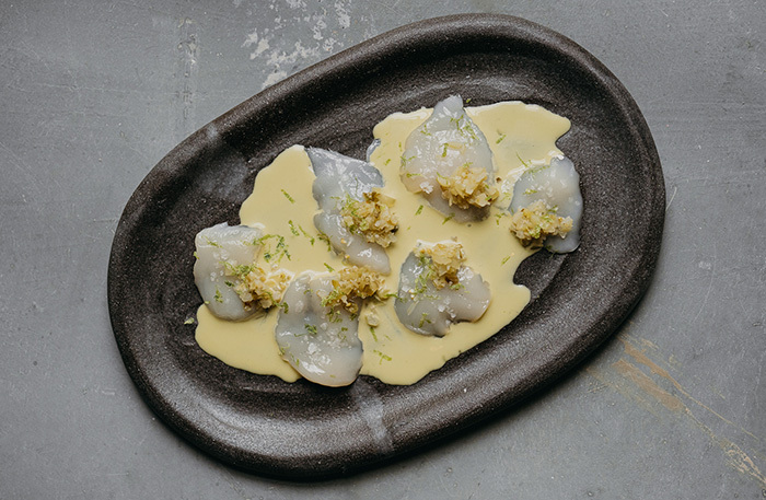 • гребешок с лактоферментированным крыжовником, топинамбуром и халапеньо — один из лучших гребешков Москвы;