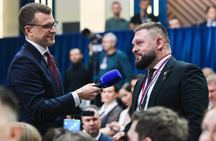 В зале герой России, участник СВО. Путин предлагает задать ему вопросы по Северску. Его спрашивают о том, кто он, откуда, как начинал свой путь.
