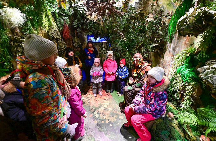 В составе несколько бесплатных вагонов — сувенирная лавка с фотокупе, вагоны-рестораны, вагон Снежной Королевы и вагоны, куда можно попасть по билетам, — «Кукольный театр» и вагон — резиденция Деда Мороза.