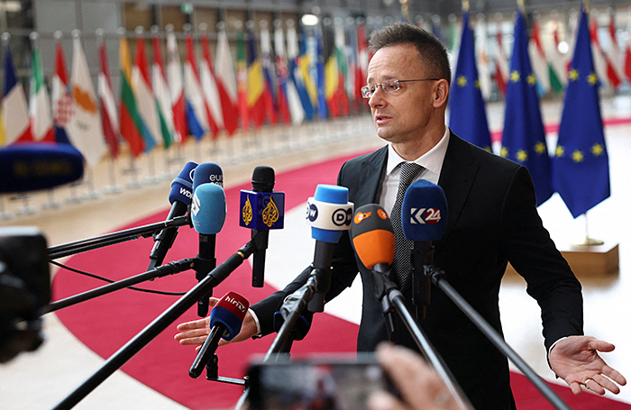 Глава МИД Венгрии Петер Сийярто выступает перед СМИ на встрече министров иностранных дел ЕС в Брюсселе. Фото: REUTERS/Yves Herman