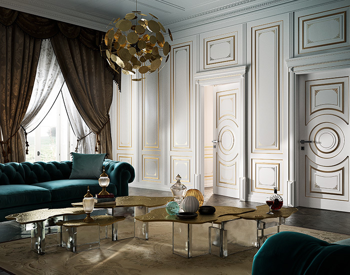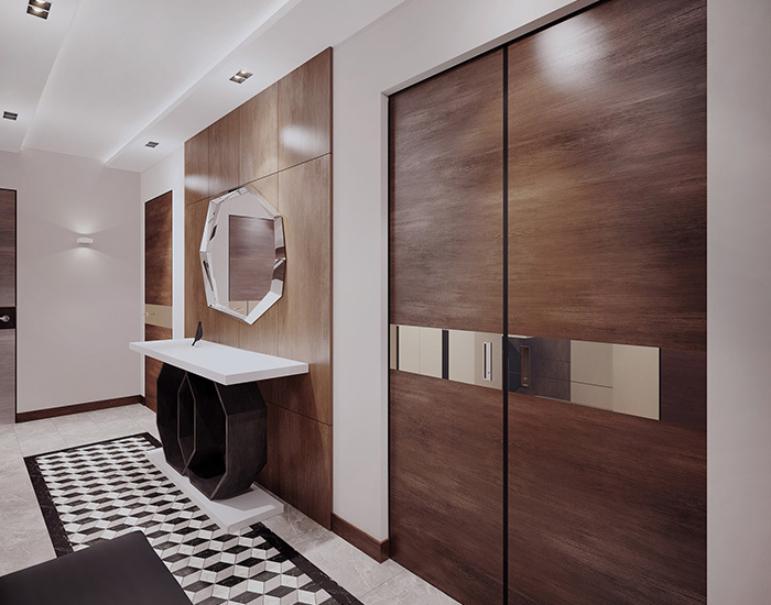Теперь несколько слов о межкомнатных дверях. Самым модным материалом для их основы остается натуральное дерево или его качественная имитация. А дальше можно играть в дизайнерские игры: хотите намекнуть на открытость пространства — сделайте в двери прозрачную вставку, хотите, напротив, продемонстрировать полную закрытость той или иной зоны — используйте для вставки совершенно непрозрачный витраж, хотите придать двери черты самостоятельной части интерьера — сделайте ее контрастно-яркого цвета… А еще можно использовать межкомнатную дверь для размещения библиотечных полок, сделать в ней отдельно открывающиеся окошки (страшно популярный сегодня прием), придать ей образ двери из «Алисы в Стране чудес» или из домика хоббита, словом, фантазировать по полной, но — не теряя чувства меры.