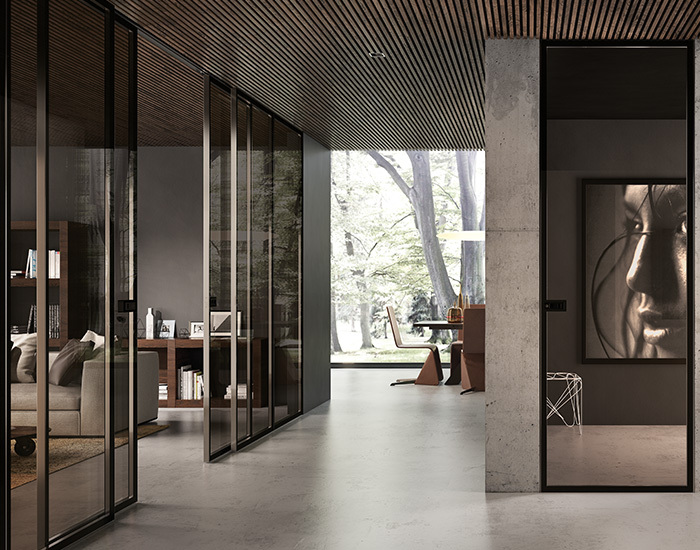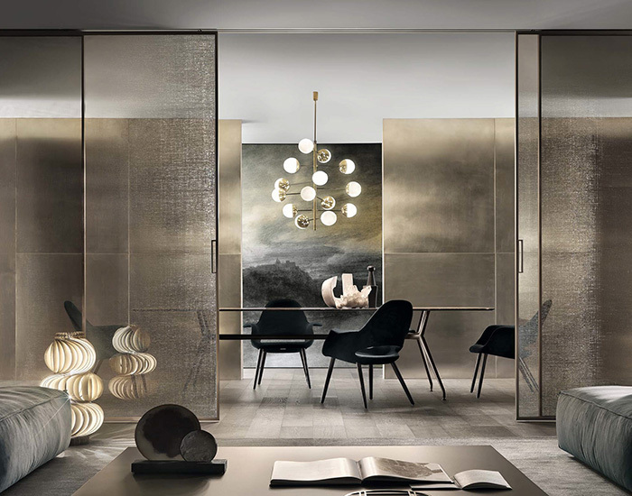 Для зонирования подойдут раздвижные стеклянные двери — прозрачные или полупрозрачные (которые, кстати, отлично работают на визуальное расширение пространства, равно как и двери чуть более узкие и увеличенной высоты). Главное — не делайте в стеклянных дверях большое число перегородок, и не переусердствуйте с декоративными элементами: для расстановки акцентов лучше использовать подсветку.