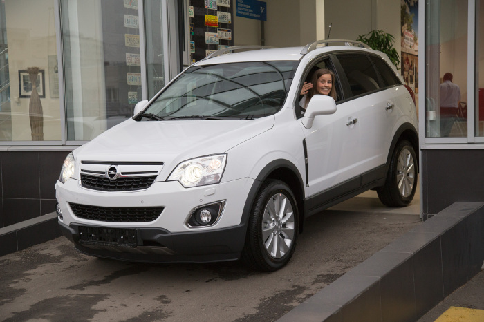 Моя коллега Екатерина приехала в дилерский центр Opel даже раньше, чем надо было. Машина, укутанная покрывалом, ее уже ждала в зоне выдачи. Томить Катю в ожидании не стали, под аплодисменты чехол был сорван, и перед нами предстал белоснежный Opel Antara. Ну а дальше, все по стандартной схеме: приятные подарки, знакомство с автомобилем, уже более детальное, вручение ключей, и Катя тожественно покидает дилерский центр Faforit Motors.